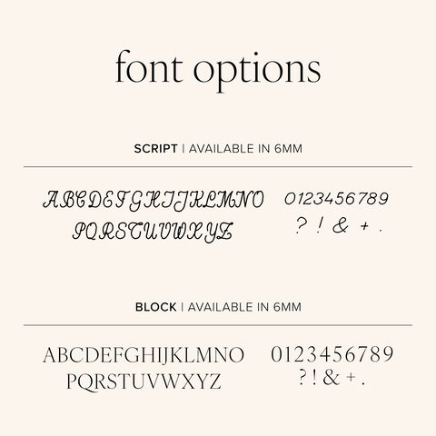 Please note: This item can only be engraved using the Script or Block fonts shown. Handwriting or image uploads are not available for this listing.