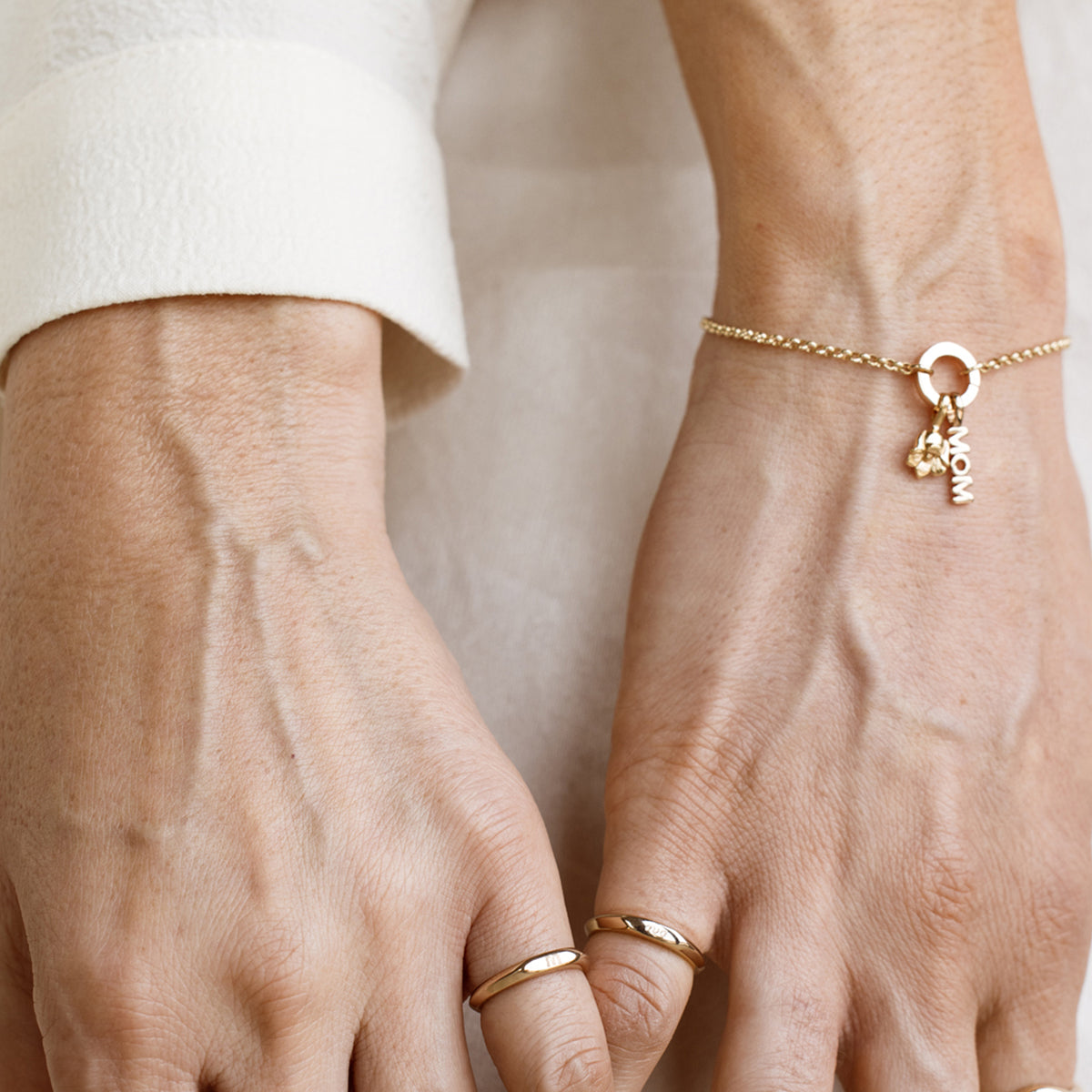 The Mom Charm features the word "mom" as a small charm that slips easily into a necklace or charm stack. Personal and easy to wear, it’s a piece that fits naturally into every day.