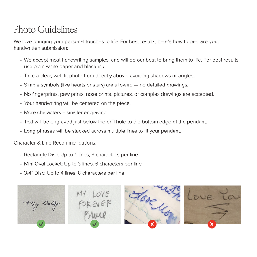 From their hand to your heart. This engraved necklace captures the subtle curves and markings that make their handwriting one of a kind. Suspended from our classic Rolo Chain Necklace, each piece is etched from a handwritten note. From a first “I love you” to a signature you’ve seen your whole life, customized in gold or silver. A meaningful way to carry their memory close, always.